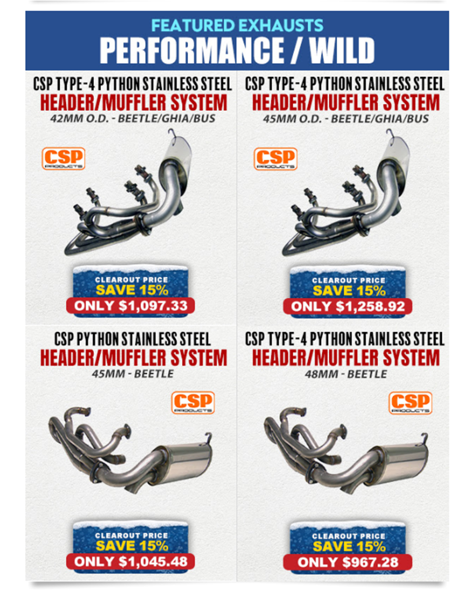 C31-251-101-045 - CSP PYTHON STAINLESS STEEL HEADER AND MUFFLER SYSTEM - 45MM (1-3/4 INCH) O.D. - BEETLE APPLICATIONS - SOLD KIT